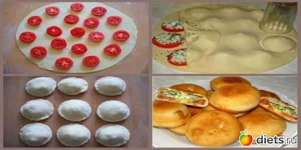 Стаканом подходящего диаметра вырезать пирожки по контурам каждого кружочка помидора, так поступаем со всеми пирожками.