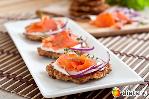 Оладушки мажем сверху сметаной, кладем немного нарезанного полукольцами красного лука и кусочки рыбы.
