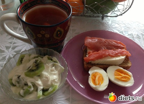 Завтрак, творог с киви был горьким, так и не поняла почему, но съела всё!