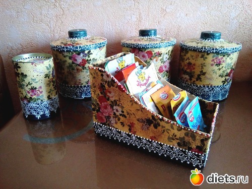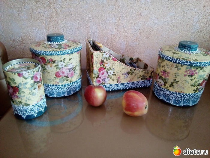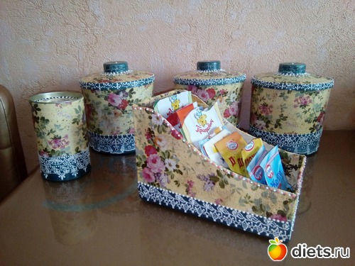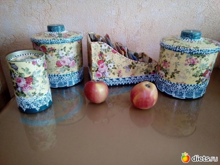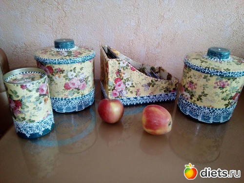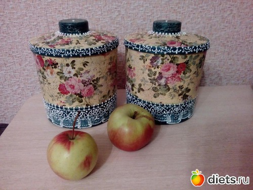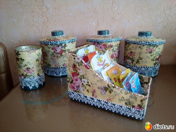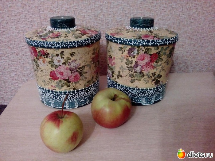 Решила не оставлять недоделок на новый год, а посему доделала к баночкам под сыпучие продукты короб для специй(склеила из нескольких слоёв картона), и ещё баночку для лаврового листа. Задекупажила, разрисовала акриловым контуром. Вот такой комплект получился, удобно:
