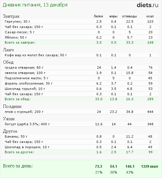 Сегодня не лучше! Хотя, белков добрала... Радует, что сегодня снова были силовые тренировки!