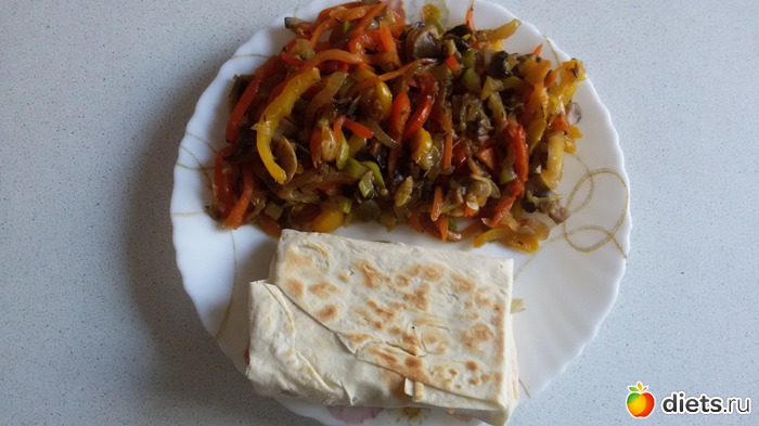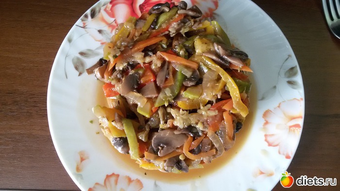 Овощи (морковка, лук, кабачок, грибы, красный и желтый перец немного потушила, добавила натертый чеснок, немного имбиря и соевого соуса).