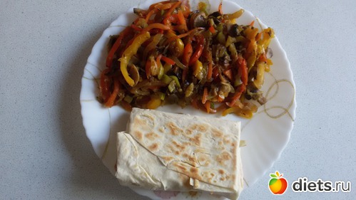 Недошаурма (натерла на терке капусту, морковку, огурец и порезала куриное филе, завернула в лаваш. обжарила на сухой сковородке с двух сторон).