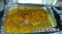 . Взяла горбушу (уже потрошеную), натёрла солью-приправой (у меня для рыбы), в брюшко положила несколько долек лимона. На столовой ложке масла пассировала 1 большую морковь и 2 луковички, посолила. Противень застелила фольгой, рыбу - в противень, сверху овощи. Налила в противень чуть воды, чтобы рыбка не была сухой и поставила запекаться. Пахнет вкусно