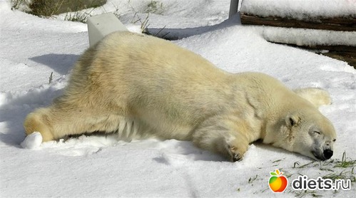 30-летняя белая медведица по имени Пайк лежит в снегу, который был привезён в Сан-Франциско ко дню её рождения.