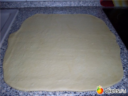 Поверх теста ложим бумагу для выпечки и аккуратно сворачиваем рулетом, таким образом мы перенесём тесто на протвень.