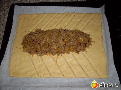 а этим временем занимаемся начинкой, капусту шинкуем, лук режем и обжариваем всё поотдельности, сначало капусту с луком (вынимаем из сковороды), затем фарш. Соеденяем всё вместе, солим, перчим.