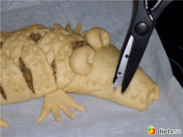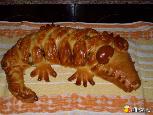 Выпекаем в разогретой до 200 град. духовке до зарумянивания, затем достаём и смазываем животное взбитым яйцом. Ставим снова в духовку до готовности