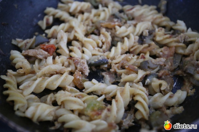 17. Приготовила мужу завтрак. Пожарила куриное мясо, помидоры, баклажаны, лук и туда спиральки..