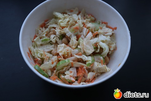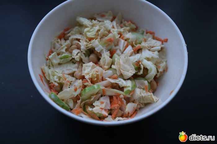 58. Сделала себе салатик вкусненький пекинская капуста, нут, морковка, чеснок и 2 ложки кефира..