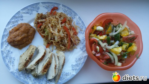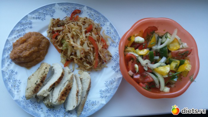 О : куриная грудка с тушенной капустой и салат из огурцов, помидоров, лука, перца и зелени еще кабачковая икра.
