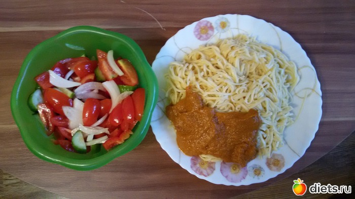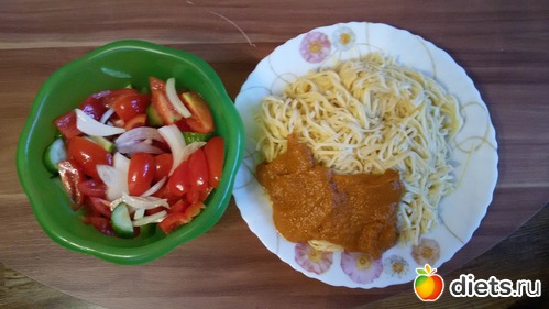 О: яичная лапша с кабачковой икрой и салатик из огурцов, помидоров, перца и лучка.