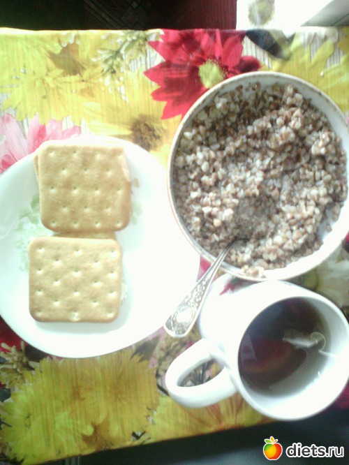 Кофе, гречка(сьела конечно не всю, половинку, делала в микроволновке и что-то н подумала, что с 4-х ст.ложек крупы, получится целая чашка), бутерброд из галетов и масла.