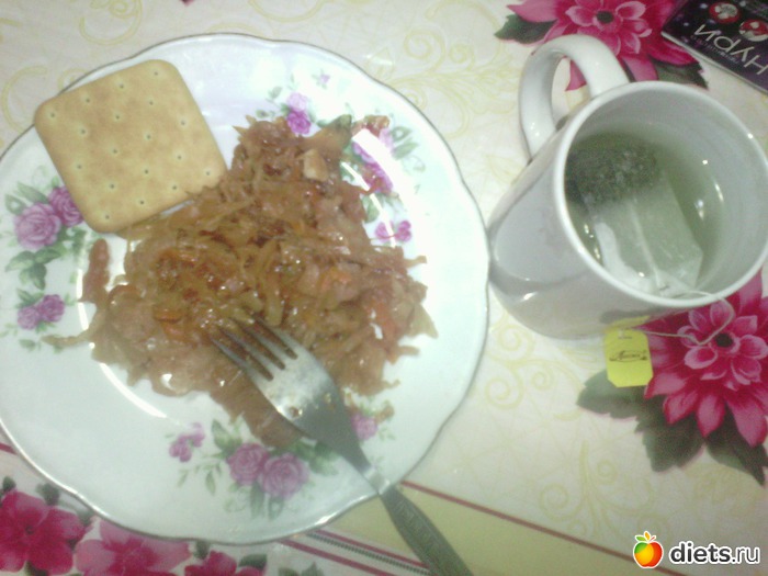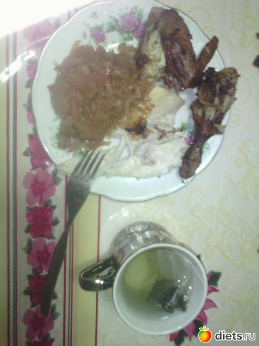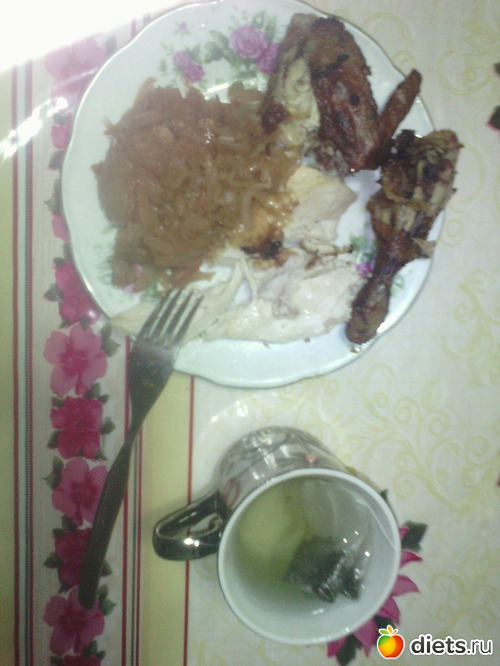 Чай, капуста и курочка(курочку была приготовлена в духовке, ее мы поделили с сыном, белое мясо ел сынок)