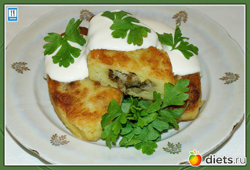 Итак: Лук очистите и мелко нарежьте. Поджарьте на растительном масле до золотистого цвета. Грибы почистите, помойте, мелко нарежьте, после чего кладем их в сковороду к луку. Посолите, поперчите, и тушите до готовности. За 2-3 минуты до готовности можно добавить раздавленный чеснок. Очищенный картофель отварите в подсоленной воде до готовности. Слейте всю воду, добавьте к картофелю сливочное масло и молотый перец, и сделайте пюре. Слегка остудив пюре, добавим яйцо и 3 ст. ложки муки, тщательно перемешаем. На разделочную доску или тарелку насыпьте около 1/2 стакана муки. Мокрой ложкой наберите картофельное тесто и положите его на мучную горку, сделайте из теста лепешку, положите на ее центр грибную начинку. Аккуратно соедините края зразы, хорошо залепите и обваляйте ее в муке. Сформованные зразы жарьте с двух сторон на растительном масле на среднем огне до румяной корочки. Перед подачей на стол полейте сметаной, украсьте листиками петрушки.
