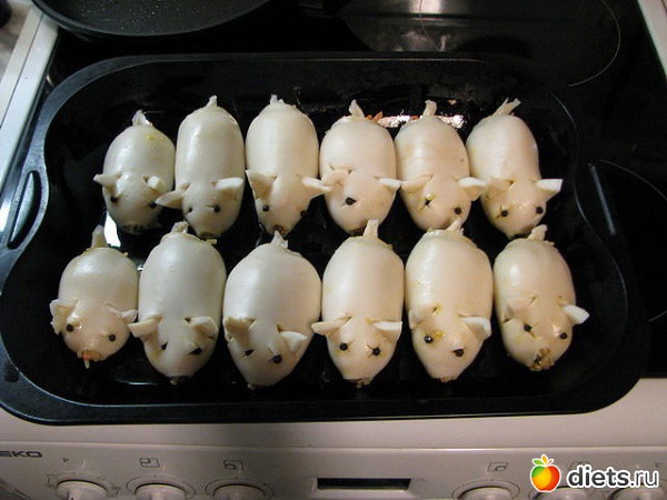 На месте ушей и глазок делаем надрезы, в них вставляем треугольнички кальмаров (те которые от хвостов и носиков) и перец горошком.))