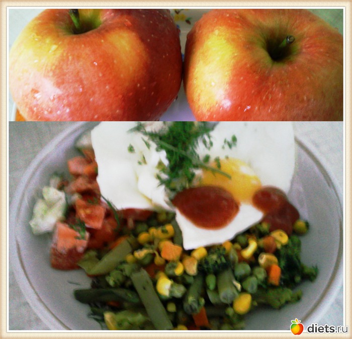 О - три яйца (жареных) овощи вареные и салатик с огурцом и помидором чуть чуть приправленный сметанкой. КУсочек хлеба. Без бульона и В конце обеща я съела кусочек сыра.