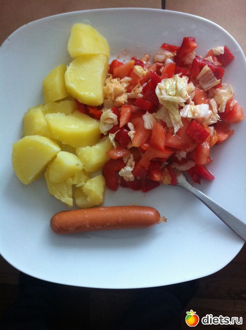 3. картошка, сосиска, салат (пекинская капуста, помидор, перец сладкий, подсолнечное масло)