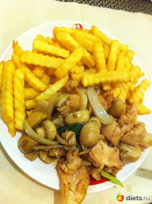 5. пол порции того что на фото - картофель фри, курица с шампиньонами и луком