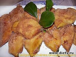 Есть у нас и особый десерт:жаренные в кляре лимонные листья! Их обмакивают в кляр и жарят в масле. Потом посыпают сахаром и корицей. И с удовольствием наблюдают, как человек несведущий давится этим неимоверно жестким листом, но ест-ведь стыдно сказать, что гордость местной кухни "какая-то... ". И когда делаешь последний, героический глоток, тебя стучат по спине и, смеясь, говорят, что вообще-то лист не едят, едят только тесто. Но зато ты прошел "посвящение" и теперь ты настоящий мурсианин!