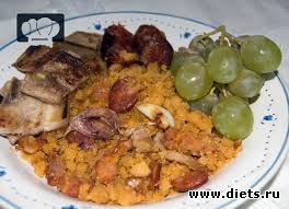 Также у нас есть одно блюдо, которое готовят только когда идет дождь(а дожди у нас идут всего пару раз в год). Это блюдо-Migas, крошки. Его готовят из муки, которую жарят на сковороде, добавляя воду, пока не получится полу густое тесто. Прекращают добавление воды и, непрерывно мешая, жарят, пока тесто не рассыплется на крошки. Отдельно жарят сало с мясными прожилками и домашние колбаски, чтобы подать с крошками. Но самое интересное, что едят его...с виноградом!!! Или вареньем из дыни!!!