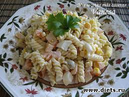 Ой,вспомнила еще одно блюдо,которое я вначале не поняла совершенно :Макаронный холодный салат с майонезом!А ,оказалось,он вполне по делу,если учитывать,снова таки,нашу жару.Очень удобен тем,что можно заранее приготовить,можно на пикники брать.