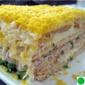 Выложить салат на плоское блюдо слоями: - морковь - лук - рыба - майонез - сверху по краю и в середине посыпать зеленью, а остальное - яйцом.