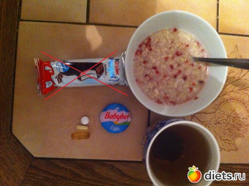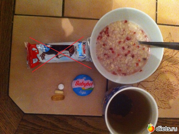 1. каша овсяная с малиной, сыр Babybel, чай, Омега 3, Кальций, витаминка. Батончик Kinder Pingue не ела, так как младший сын уволок