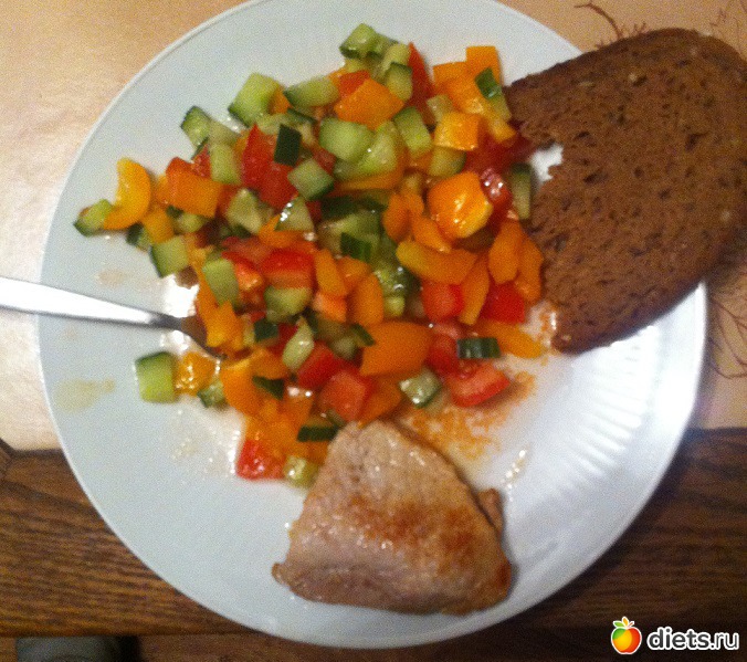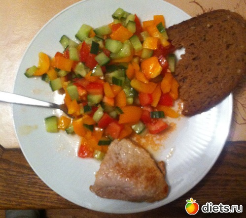 5. маленький кусочек свинины постной, салат (огурец, помидор, сладкий перец), хлеб