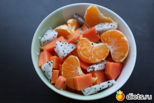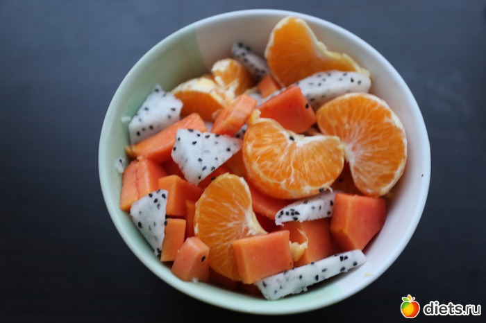 Полдник в 15-00 салатик из фруктов: папайя, драконий фрукт и мандаринка.