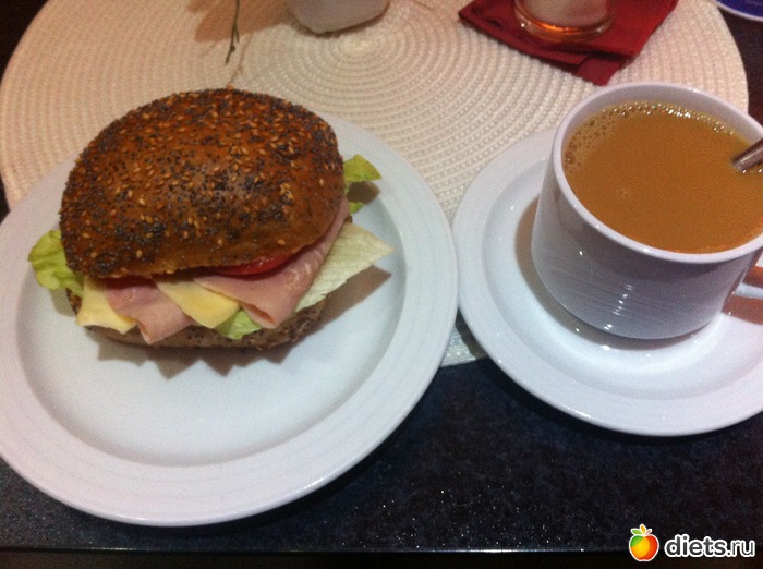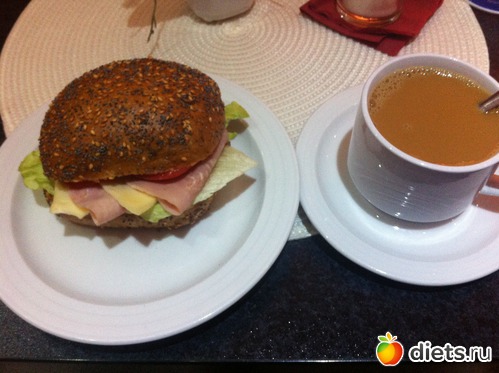 2. кофе, бутерброд с ветчиной, салатом и сыром