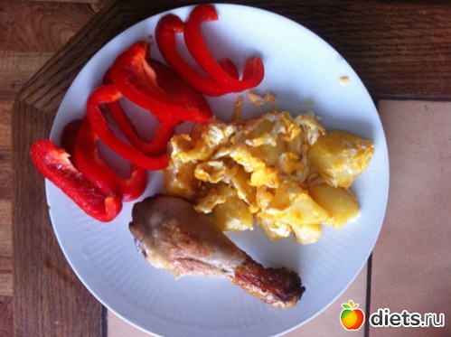 3. куриная ножка, красный сладкий перец, картошка с яйцом