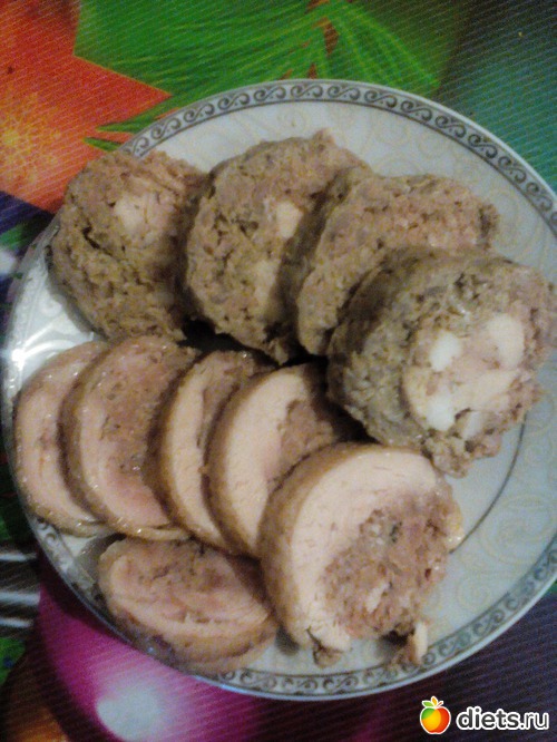 А два других сделала наоборот, на фарш выложила нарезанные кусочки куриных бедрышек и адыгейского сыра. Завернула в плёнку и дополнительно положила в целофан, отваривала 40 минут. Получилось 5 рулетов.