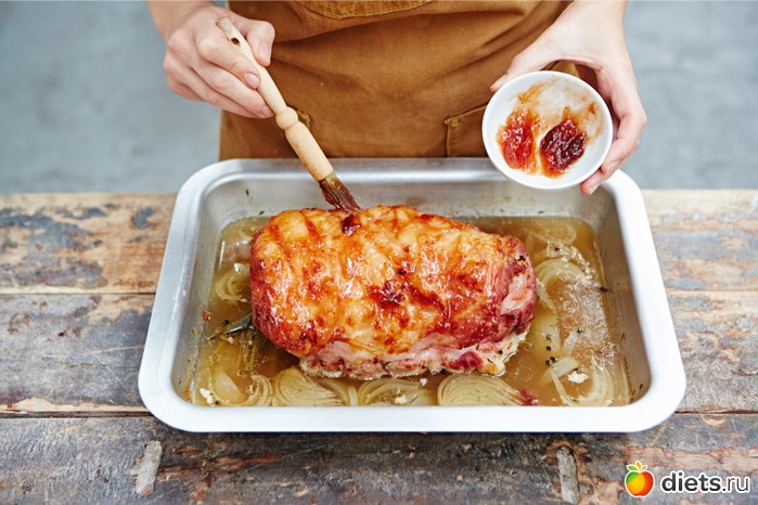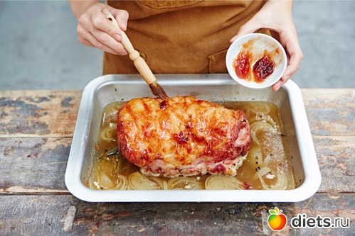 5Вновь поместите свинину в форму для выпечки и запекайте 20 минут. Смажьте мясо небольшим количеством апельсинового джема или посыпьте свежим розмарином. Отправьте вновь в духовку на час.