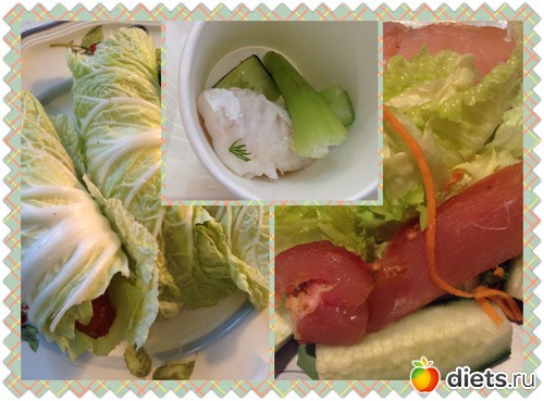 На перекусы брала рулетики из вяленой куриной грудки и китайской капусты, а от обеда в стаканчик отщипнула судака, огурец, сельдерей.