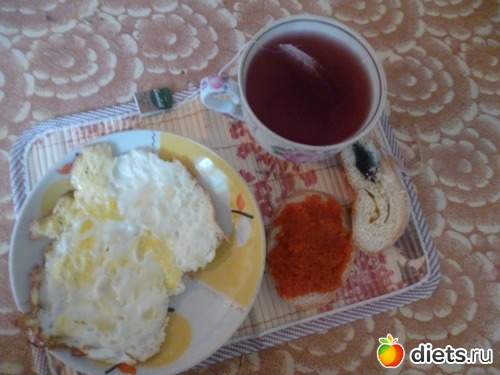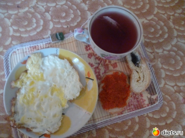 2 яйца поджаренных на капле масла, бутерброд с морковной икрой, кусочек булочки и чай Festive Grape