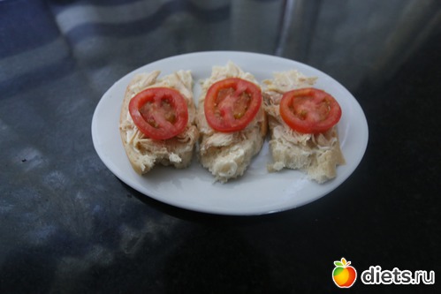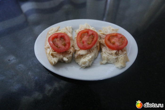 4. Мужу на первый завтрак приготовила полезные бутерброды- свой хлеб без дрожжей, куриная грудка и помидорка.