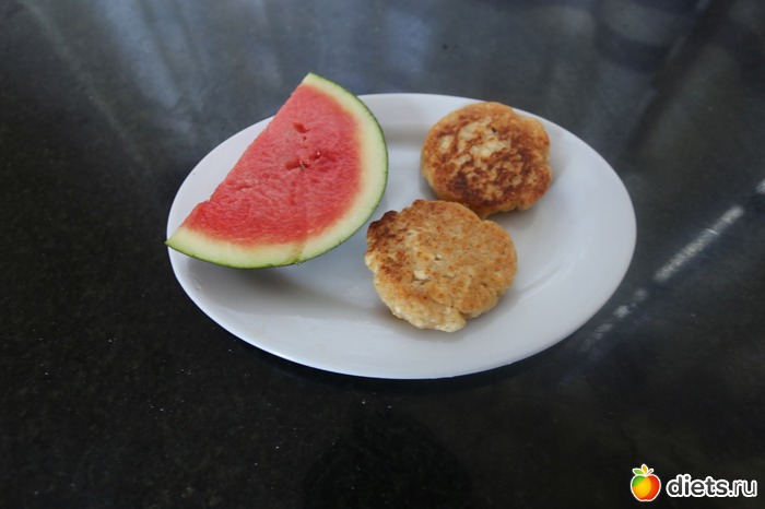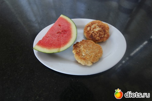 Завтрак в 9-00 сырники из тофу с корицей и долька арбуза