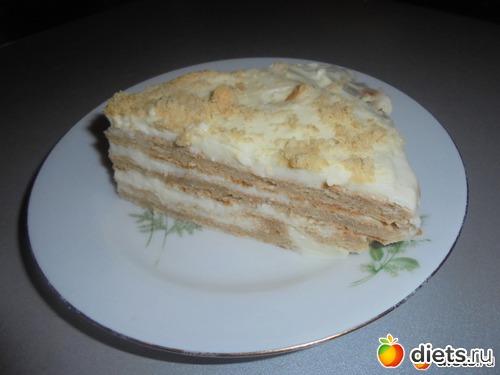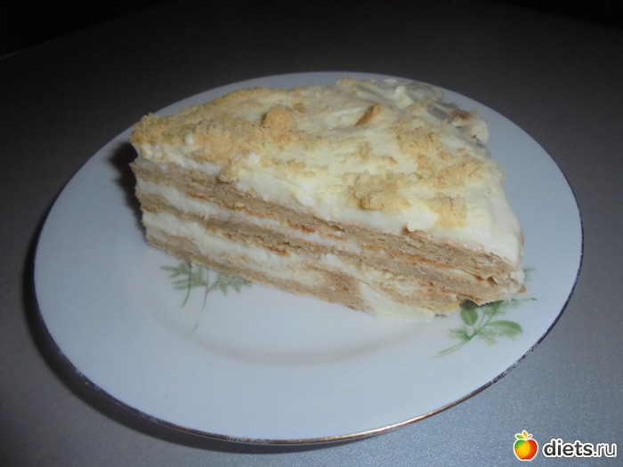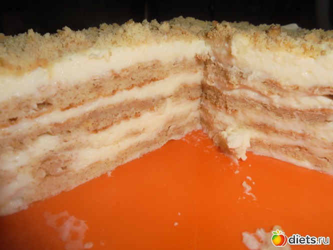Чуть теплые коржи, верх и бока тщательно промазать кремом и обсыпать крошкой из тертого печенья. Поставить в холодильник на 2 - 4 часа (лучше на ночь).