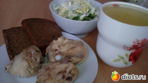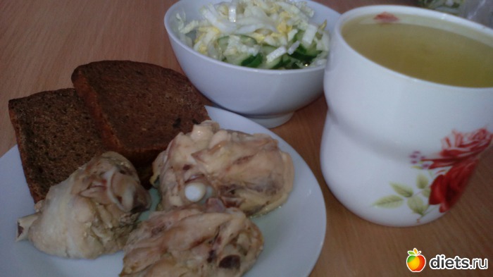 Обед: отварная курочка, салат (пекинка,+огурец +чеснок+масло), хлеб, бульон