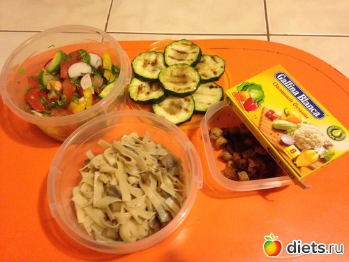 Обед:макароны с грибами+кабачки гриль+салат из св. овощей(огурец, редис, болг.перец, помидор, зел.лук, укроп, ч.л.масла)+овощ.бульон из 1/2 кубика