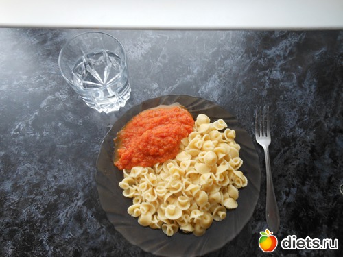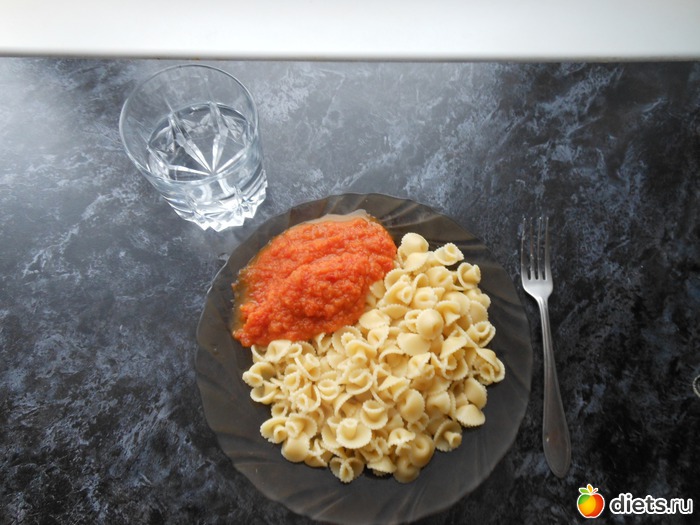 С учетом того,что обедала я около 3 часов дня,порция огромная получилось из 100 грамм сухих макарон.Я её не осилила(на фот нет куска зернового хлеба).Ужин был около 7 к тому времени я особо не проголодалось,поэтому,шоколада и печенья хватило