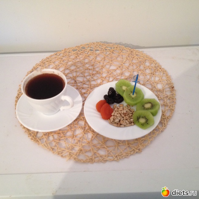 Завтрак: кофе черный варёный, ядра семечек- 10 гр, 2 кураги, 3 черносливины и одна киви.