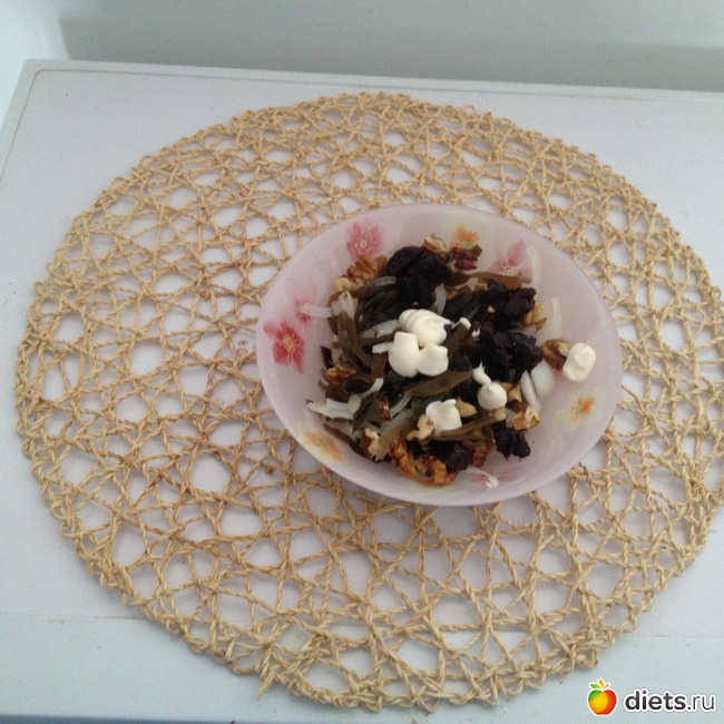Перекус;Салат из морской капусты (морская капуста, чернослив, грецкий орех, репчатый лук и немного майонеза). Понимаю что майонез НАРУШЕНИЕ, а без заправки невкусно. Некрасивый, но очень вкусный и питательный.