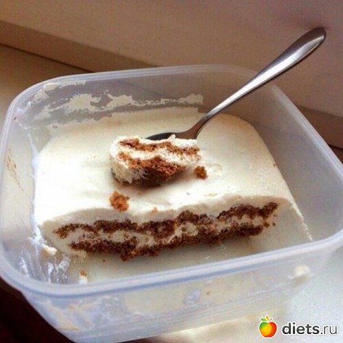 Остывший корж разрезаем на 4 части и укладываем в контейнер:корж, творожную массу, корж, творожную массу. Ставим в холодильник до застывания.(25-40минут)