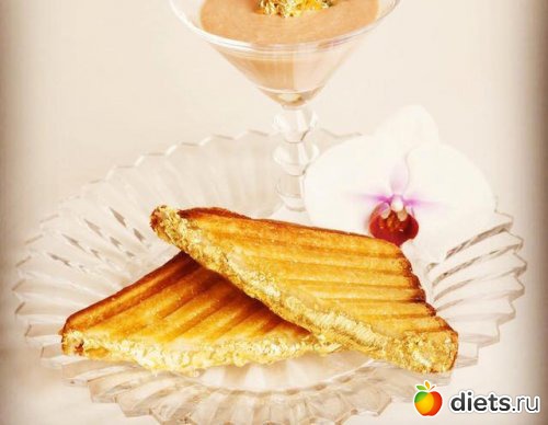 Горячий сэндвич, обёрнутый в тонкое листовое золото, подаётся с томатным супом с южноафриканскими омарами и трюфельным маслом. Одна порция супа с сэндвичем обойдётся в 214 долларов.