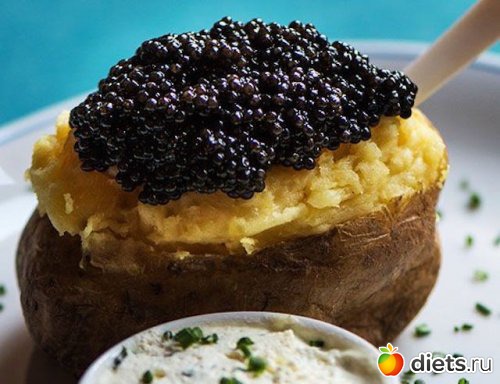 Если не принимать во внимание, что это "всего лишь картофель, запекаемый в духовке в течение часа", то становится понятным, почему в ресторане французской кухни "Caviar Kaspia" (Париж, Франция) готовят печёный с обеих сторон картофель, увенчанный белужьей икрой, который подают со свежими сливками (crème fraîche).