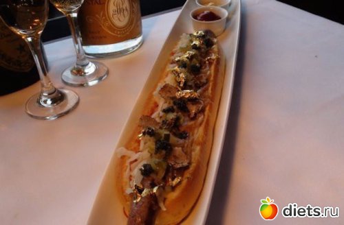 Хот-доги — самая популярная на бейсбольном стадионе и невероятно дешёвая еда. Самый дорогой хот-дог продаётся в ресторане "230 Fifth" в Нью-Йорке. Это блюдо длиной около 30 см готовится с мраморной говядиной Вагю с добавлением чёрных трюфелей. Всё это подаётся в сладкой булке бриошь, смазанной трюфельным маслом, а также органическим кетчупом и горчицей, импортируемых из Франции. Сверху булка посыпается луком, карамелизированным в шампанском "Dom Perignon" и бальзамическом уксусе стоимостью 389 долларов за бутылку. Кроме лука в блюдо добавляется квашеная капуста, приготовленная с дорогостоящей осетровой икрой. Всё это украшается съедобным тонким листовым золотом. Один хот-дог стоит 2300 долларов, а прибыль с продажи идёт на благотворительные цели в организацию "City Harvest", деятельность которой направлена на кормление голодных.
