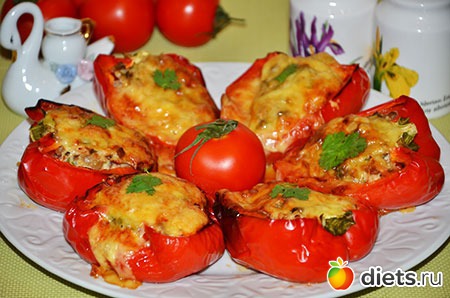 Выложить их в форму для запекания и присыпать тертым сыром. Убрать фаршированные перцы в духовку и запекать 1 час при температуре 180-200 градусов.
