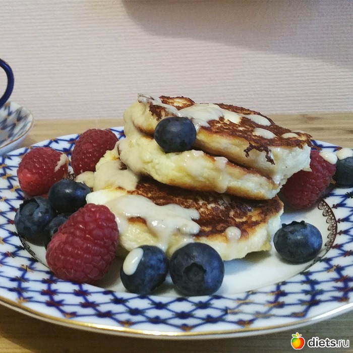 500 гр немецкого обезжиренного творога размешиваю с 2 яйцами, добавляю 2 ст. ложки сахара и 3 ст. ложки муки, размешиваю и в конце добавляю 2 ст. ложки лимонного сока, жарю в масле, выкладываю на бумажную салфетку, чтоб не сильно жирные были и подаю с яблочным муссом